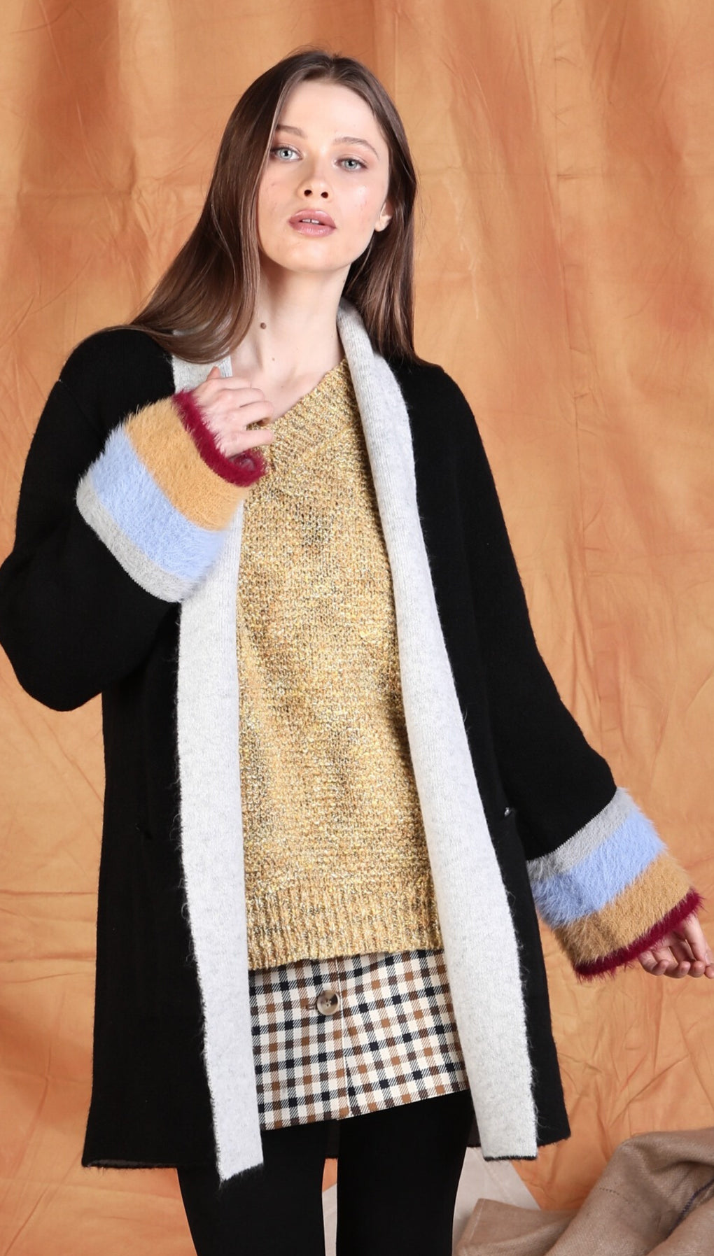 - Details: Color Blocked cardifan with short fur striped rainbow cuff