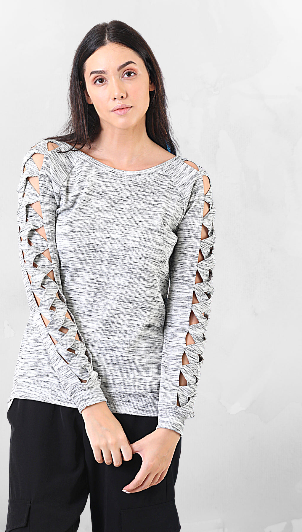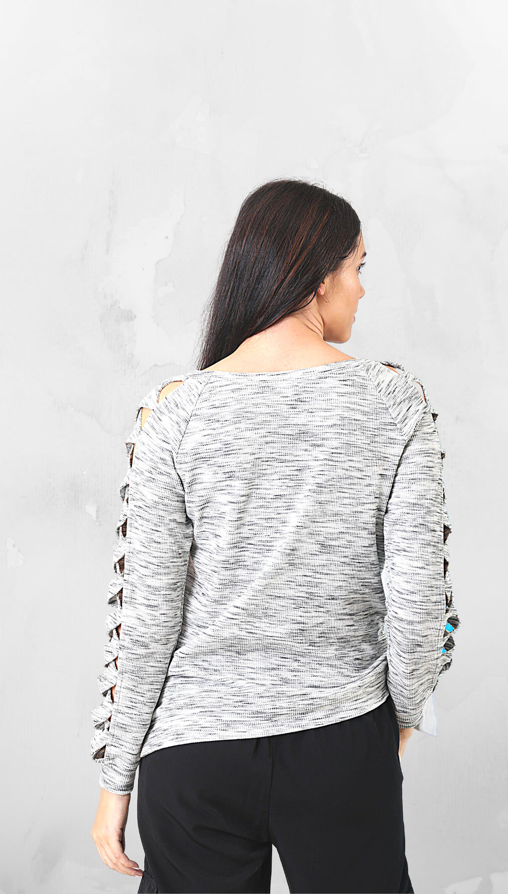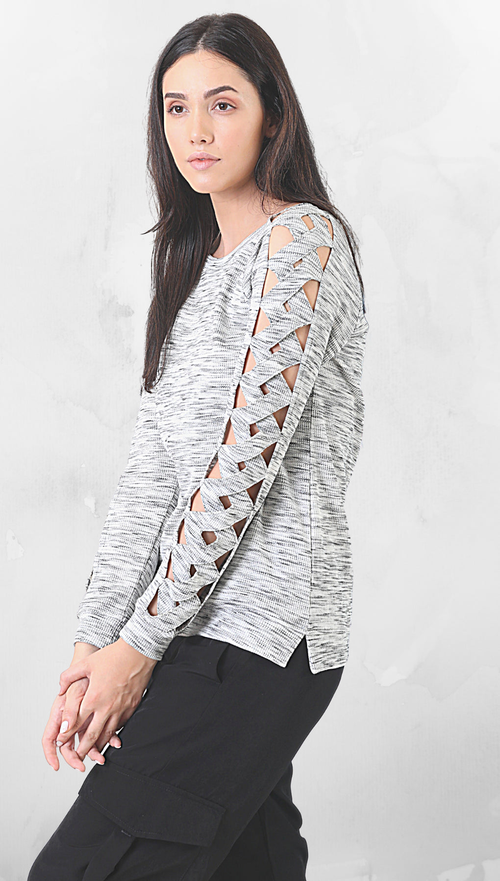 A relaxing fit sweater top, with criss cross stitch detail on the sleeves, round neck, and long sleeves.