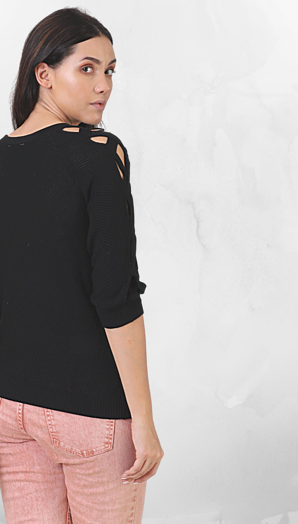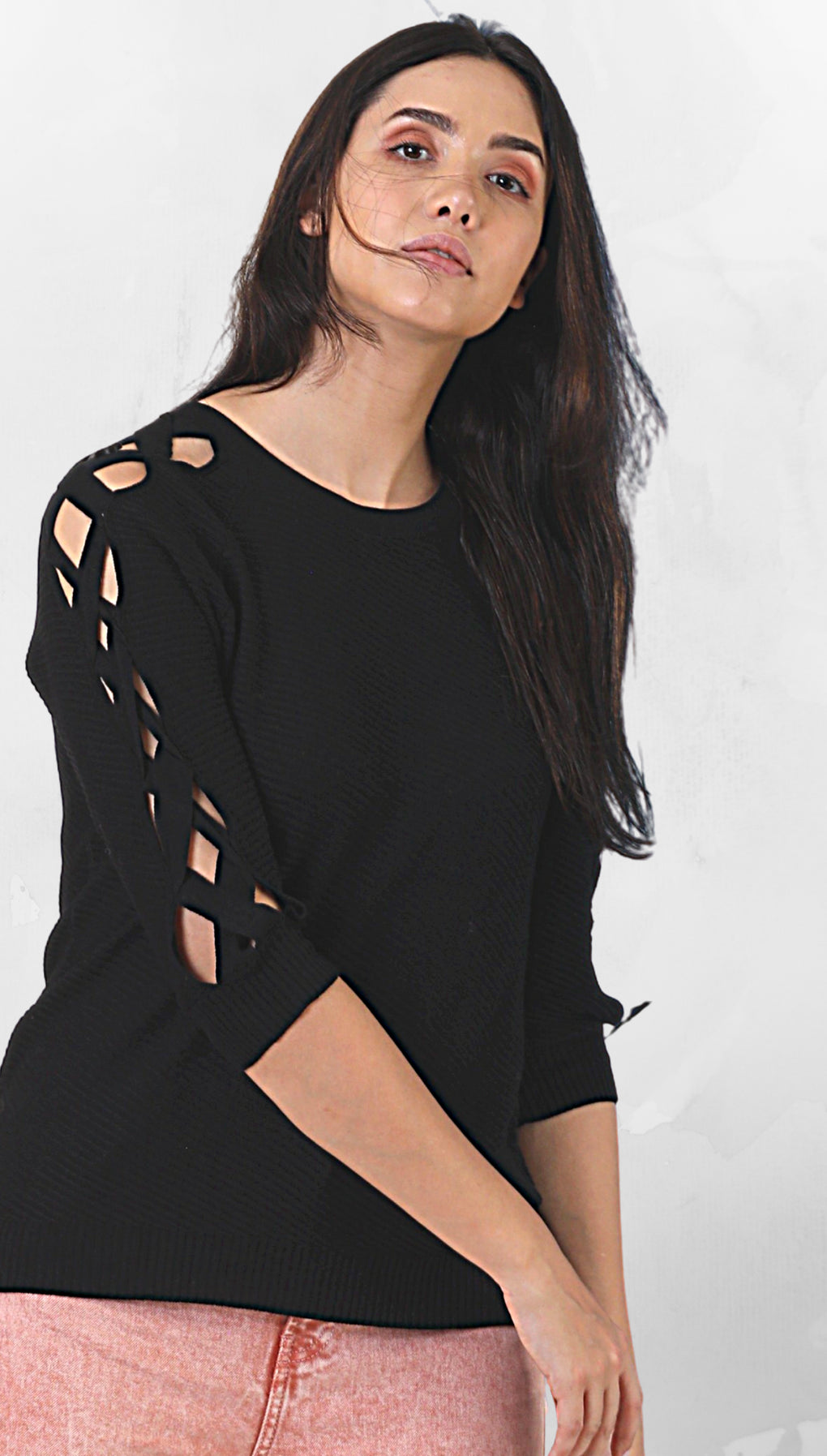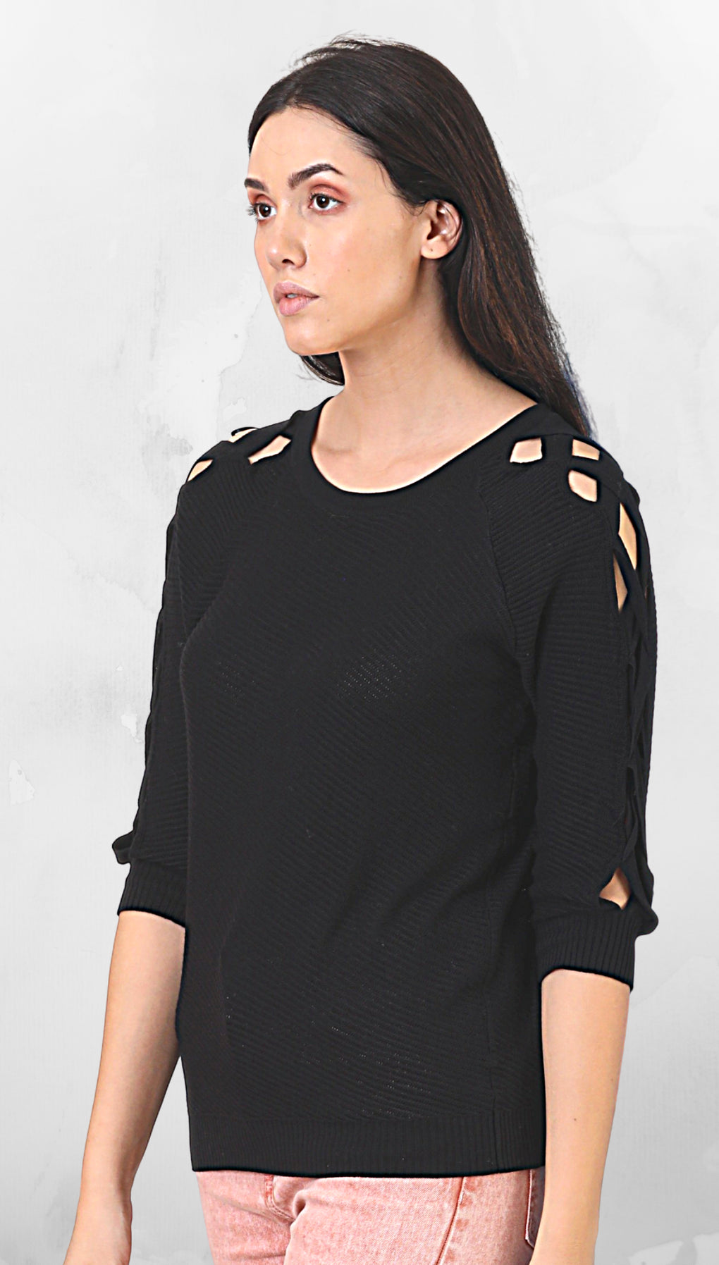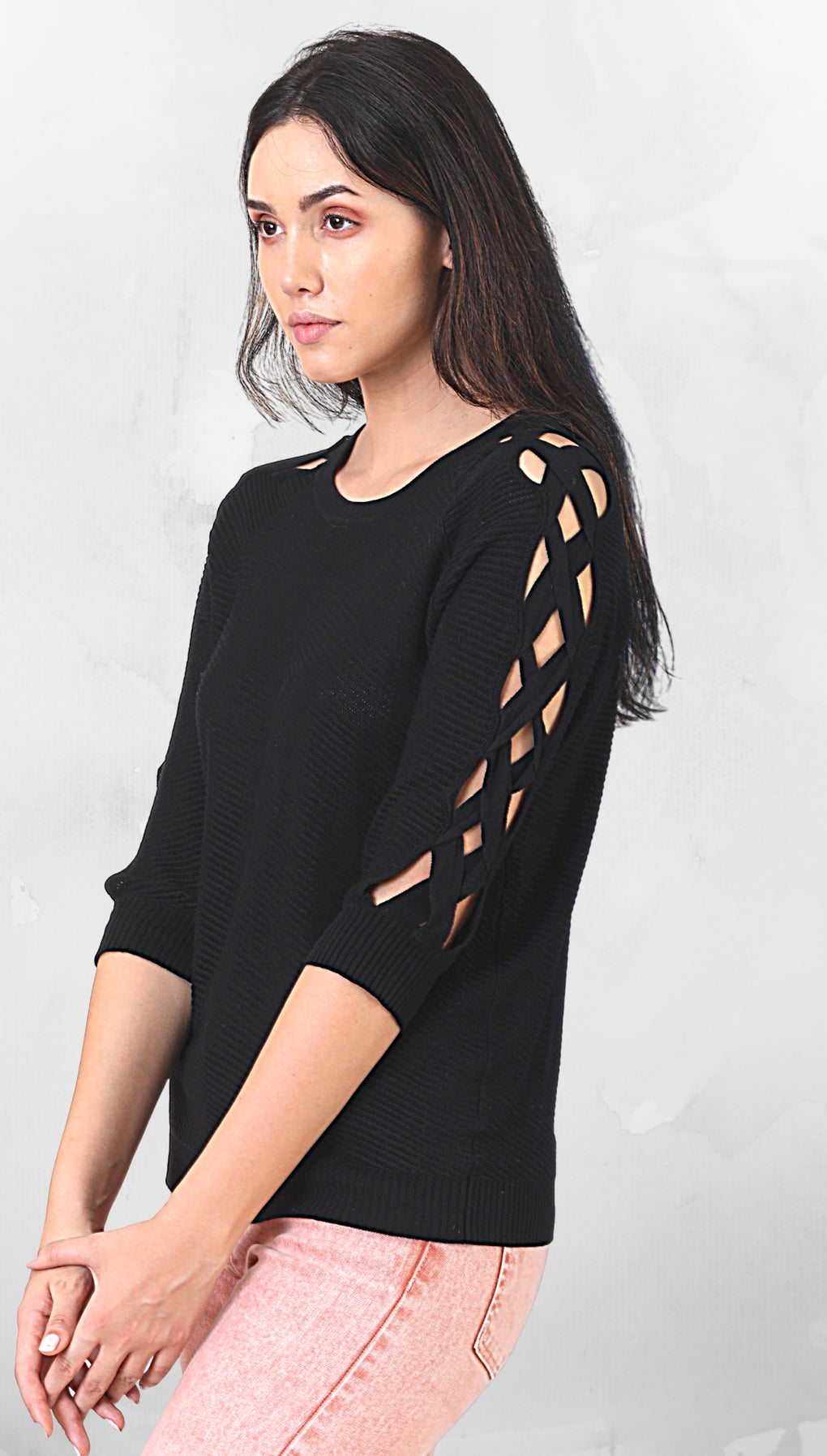 A relaxing fit sweater top, with criss cross stitch detail on the sleeves, round neck, and 3/4 sleeves.